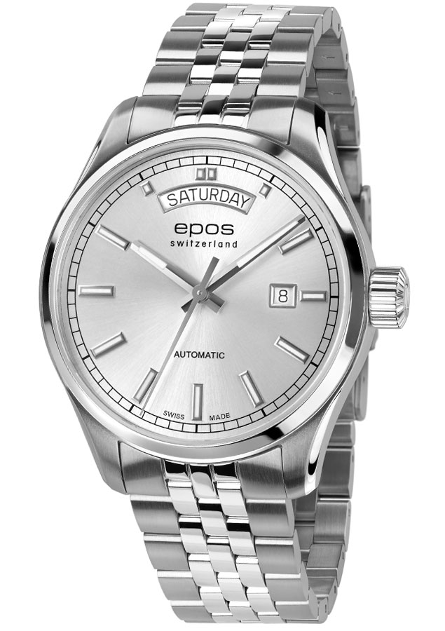 EPOS 3501 Day Date napędza pięknie zdobiony i samo nakręcający się mechanizm Sellita SW240. Szwajcarski werk jest widoczny przez przeszklony mineralnym szkłem dekiel. Popularna koperta Epos Passion o średnicy 41 mm jest idealną obudową na męski nadgarstek. Ozdobiona polerowanym pierścieniem i polerowanymi brzegami. Oprócz datownika na godzinie 12 i na 3 ten wysokiej jakości zegarek jest wodoszczelny do 100 m 10 barów, a odporne na zarysowania szafirowe szkiełko jest integralną częścią standardu jakości EPOS. Srebrna tarcza z pięknym zdobieniem słonecznym, które rozprowadza światło od centrum po brzegi cyferblatu.