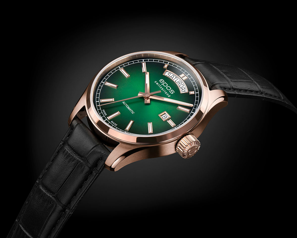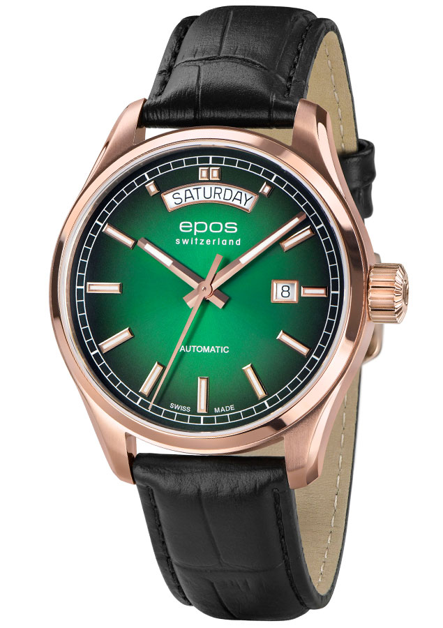 EPOS 3501 Day Date napędza pięknie zdobiony i samo nakręcający się mechanizm Sellita SW240. Szwajcarski werk jest widoczny przez przeszklony mineralnym szkłem dekiel. Popularna koperta Epos Passion o średnicy 41 mm jest idealną obudową na męski nadgarstek. Ozdobiona polerowanym pierścieniem i polerowanymi brzegami, pokryta powłoką PVD w kolorze różowego złota. Oprócz datownika na godzinie 12 i na 3 ten wysokiej jakości zegarek jest wodoszczelny do 100 m 10 barów, a odporne na zarysowania szafirowe szkiełko jest integralną częścią standardu jakości EPOS. Zielona tarcza z pięknymi przejściami dodatkowo jest ozdobiona szlifem słonecznym, który rozprowadza światło od centrum po brzegi cyferblatu.
