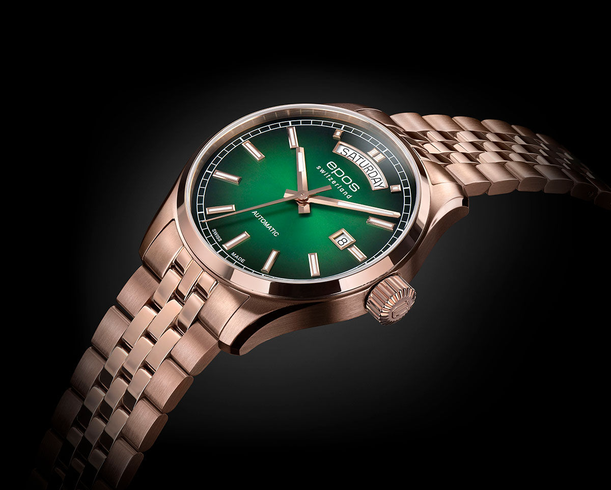 EPOS 3501 Day Date napędza pięknie zdobiony i samo nakręcający się mechanizm Sellita SW240. Szwajcarski werk jest widoczny przez przeszklony mineralnym szkłem dekiel. Popularna koperta Epos Passion o średnicy 41 mm jest idealną obudową na męski nadgarstek. Ozdobiona polerowanym pierścieniem i polerowanymi brzegami, pokryta powłoką PVD w kolorze różowego złota. Oprócz datownika na godzinie 12 i na 3 ten wysokiej jakości zegarek jest wodoszczelny do 100 m 10 barów, a odporne na zarysowania szafirowe szkiełko jest integralną częścią standardu jakości EPOS. Zielona tarcza z pięknymi przejściami dodatkowo jest ozdobiona szlifem słonecznym, który rozprowadza światło od centrum po brzegi cyferblatu.