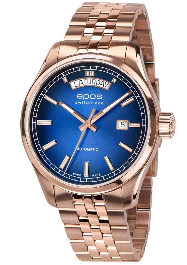 EPOS 3501 Day Date napędza pięknie zdobiony i samo nakręcający się mechanizm Sellita SW240. Szwajcarski werk jest widoczny przez przeszklony mineralnym szkłem dekiel. Popularna koperta Epos Passion o średnicy 41 mm jest idealną obudową na męski nadgarstek. Ozdobiona polerowanym pierścieniem i polerowanymi brzegami, pokryta powłoką PVD w kolorze różowego złota. Oprócz datownika na godzinie 12 i na 3 ten wysokiej jakości zegarek jest wodoszczelny do 100 m 10 barów, a odporne na zarysowania szafirowe szkiełko jest integralną częścią standardu jakości EPOS. Niebieska tarcza z pięknymi przejściami dodatkowo jest ozdobiona szlifem słonecznym, który rozprowadza światło od centrum po brzegi cyferblatu.