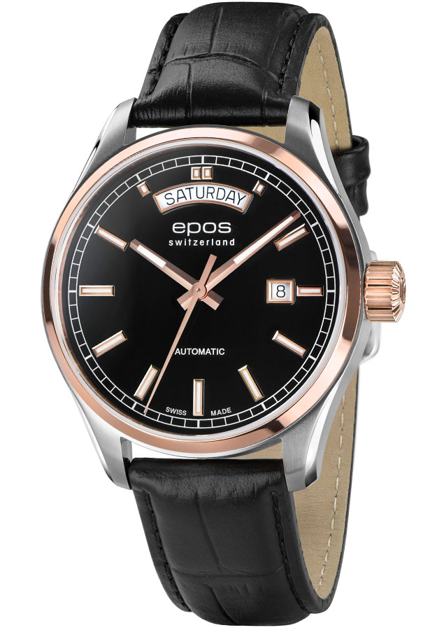 EPOS 3501 Day Date napędza pięknie zdobiony automatyczny się mechanizm Sellita SW240. Szwajcarski werk jest widoczny przez przeszklony mineralnym szkłem dekiel. Popularna koperta Epos Passion o średnicy 41 mm jest idealną obudową na męski nadgarstek. Ozdobiona polerowanym pierścieniem pozłoconym PVD w kolorze różowego złota i polerowanymi brzegami. Oprócz datownika na godzinie 12 i na 3 ten wysokiej jakości zegarek jest wodoszczelny do 100 m 10 barów, a odporne na zarysowania szkło szafirowe jest integralną częścią standardu jakości EPOS. Czarna tarcza jest lakierowana, ozdobiona liniowymi indeksami, które są wypełnione substancją luminescencyjną. Ten sam świecący motyw znajduje się na wskazówkach. Elegancki czarny pasek skórzany ze wzorem aligatora dopełnia cały projekt.
