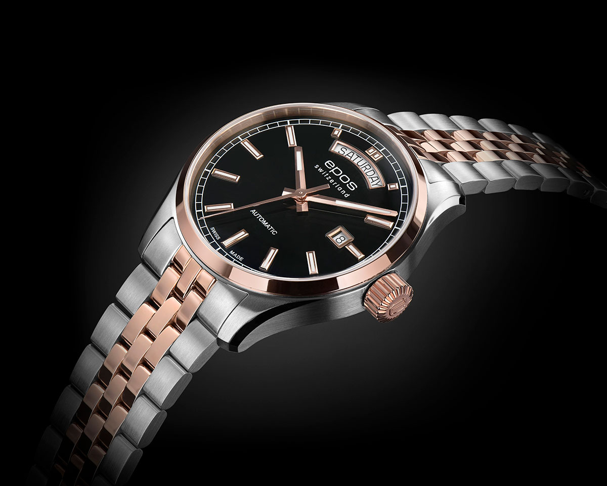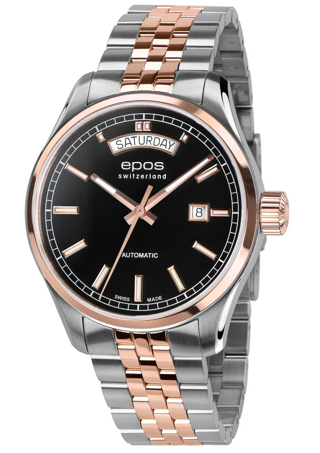 EPOS 3501 Day Date napędza pięknie zdobiony automatyczny się mechanizm Sellita SW240. Szwajcarski werk jest widoczny przez przeszklony mineralnym szkłem dekiel. Popularna koperta Epos Passion o średnicy 41 mm jest idealną obudową na męski nadgarstek. Ozdobiona polerowanym pierścieniem pozłoconym PVD w kolorze różowego złota i polerowanymi brzegami. Oprócz datownika na godzinie 12 i na 3 ten wysokiej jakości zegarek jest wodoszczelny do 100 m 10 barów, a odporne na zarysowania szkło szafirowe jest integralną częścią standardu jakości EPOS. Czarna tarcza jest lakierowana, ozdobiona liniowymi indeksami, które są wypełnione substancją luminescencyjną. Ten sam świecący motyw znajduje się na wskazówkach. Dzięki wyjmowanym ogniwom możną ją dopasować do każdego nadgarstka.