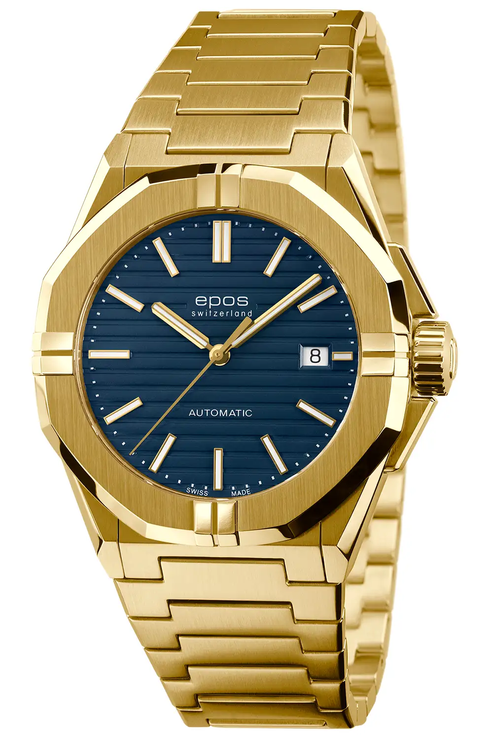 Złoty zegarek męski Epos Sport z granatową tarczą oferuje elegancki i wyrazisty wygląd w sportowej konstrukcji. Automatyczny mechanizm SW200 gwarantuje niezawodność, a szkło szafirowe chroni tarczę przed zarysowaniami.