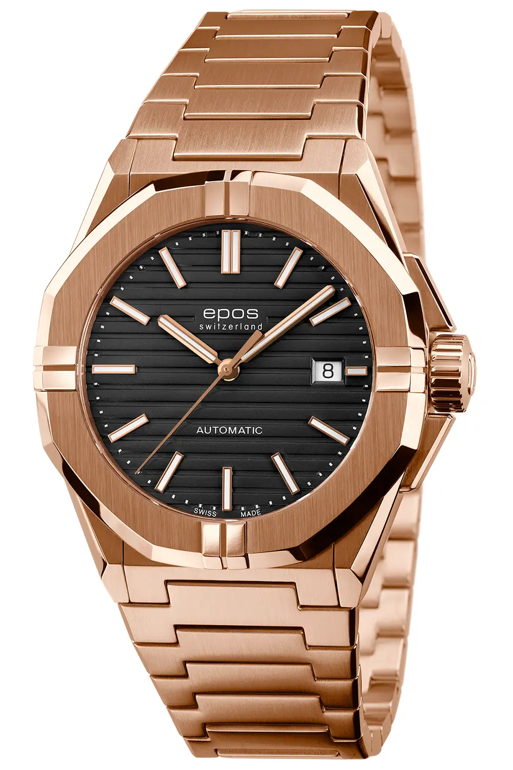 Zegarek Epos Sport w kolorze różowego złota łączy wyrazisty styl z codzienną funkcjonalnością. Czarna tarcza i dekorowany mechanizm automatyczny SW200 tworzą elegancki, sportowy charakter modelu.