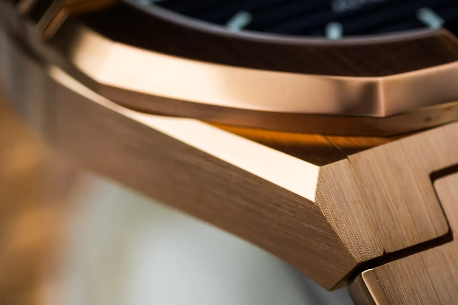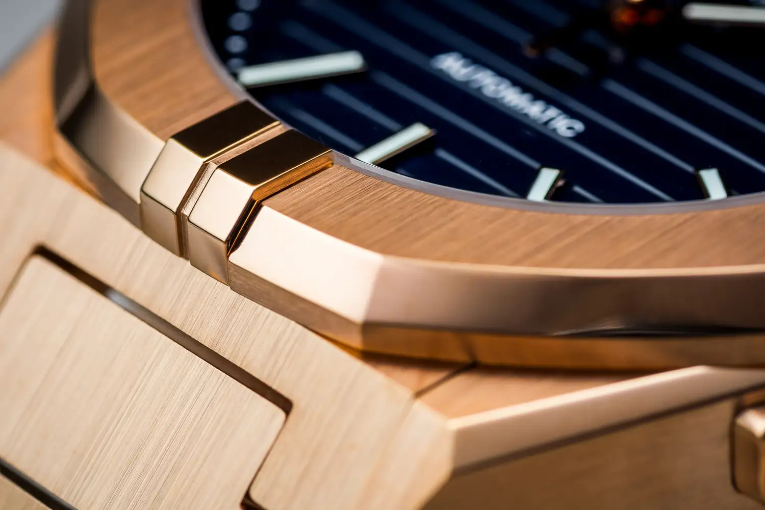 Koperta i bransoleta otrzymały trwałą powłokę PVD w kolorze różowego złota, dzięki czemu model przyciąga wzrok subtelnym blaskiem i świetnie sprawdza się zarówno na co dzień, jak i w bardziej formalnych sytuacjach. Czarna tarcza z poziomymi tłoczeniami zapewnia wysoką czytelność, a precyzyjnie nałożone indeksy i wskazówki z jasną masą luminescencyjną ułatwiają szybki odczyt godziny. Na godzinie trzeciej znajduje się praktyczne okno daty.