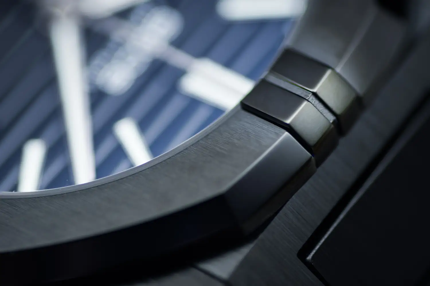 Czarny cyferblat ma poziomą fakturę, która subtelnie łamie światło i ułatwia szybki odczyt. Szerokie wskazówki i wydłużone indeksy wypełniono masą świecącą, więc po zmroku czas pozostaje czytelny. Okno daty na godzinie 3 otrzymało jasne tło, co zwiększa kontrast i skraca moment szukania bieżącego dnia miesiąca. Projekt jest spójny i funkcjonalny: czarne elementy nie zlewają się, a detale są widoczne pod różnymi kątami patrzenia.