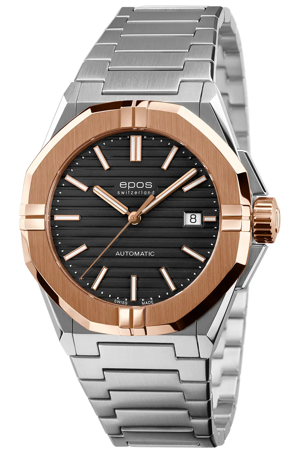 Zegarek męski Epos Sport z czarną tarczą i akcentami PVD w kolorze różowego złota oferuje elegancki styl połączony z mechanizmem automatycznym SW200 oraz wodoszczelnością 10 ATM.