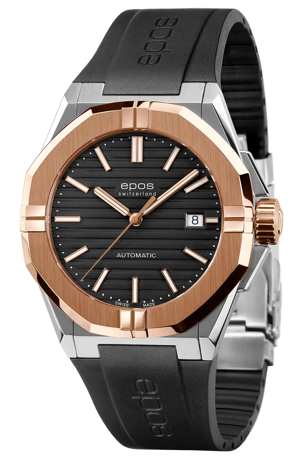 Sportowy zegarek Epos Sport w stalowej kopercie z różowozłotym pierścieniem łączy elegancję z nowoczesnym charakterem. Czarna tarcza z poziomową strukturą zapewnia wysoką czytelność, a mechanizm automatyczny SW200 widoczny przez dekiel dodaje prestiżu.