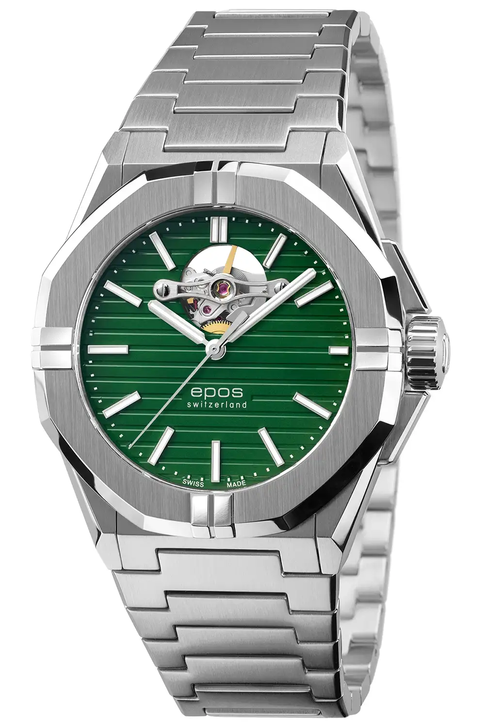 Epos Sport Open Heart to sportowy zegarek męski z zieloną tarczą i z widocznym balansem. Mechanizm automatyczny SW200 widać także przez przeszklony dekiel. Wodoszczelność 100 m pozwala pływać.