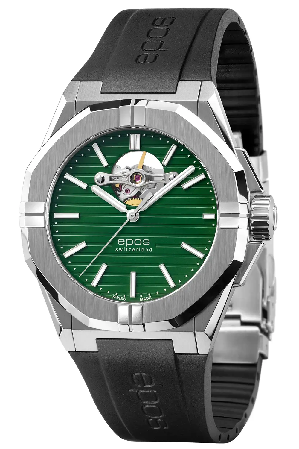 Epos Sport Open Heart 3506.133.20.13.55 to sportowy zegarek męski z zieloną tarczą i otwartym balansem w stalowej kopercie 41 mm. Szkło szafirowe i pasek z tworzywa zapewniają wygodę oraz trwałość.