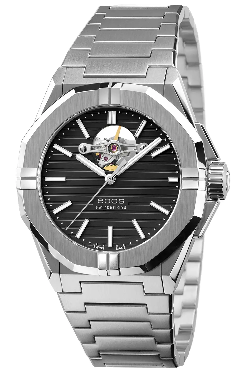 Epos Sport Open Heart 3506.133.20.15.30 to męski zegarek automatyczny ze stalową bransoletą, czarną tarczą i widocznym balansem. Wytrzymała konstrukcja i szkło szafirowe zapewniają codzienną wygodę.