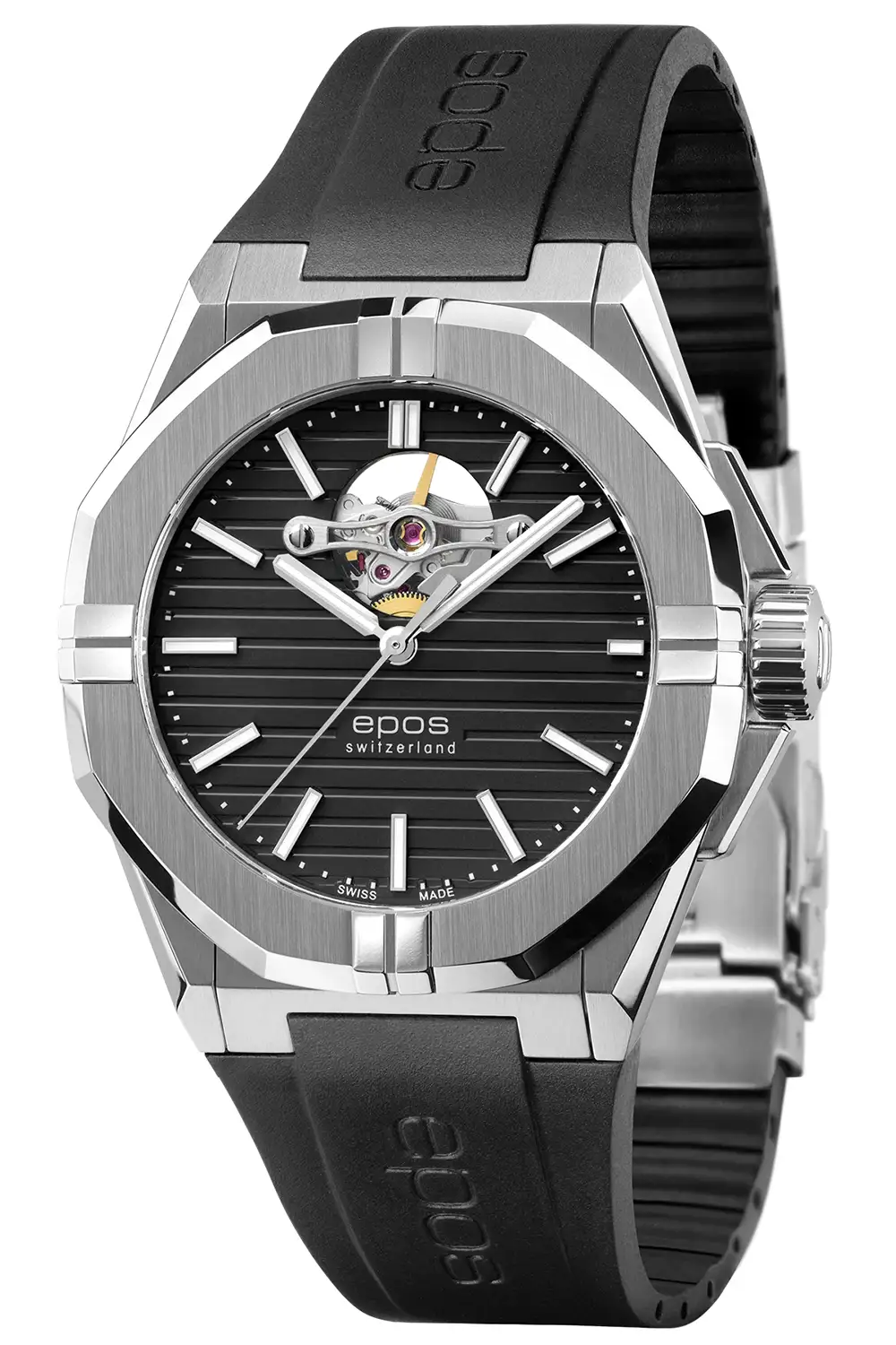 Epos Sport Open Heart 3506.133.20.15.55 to męski zegarek automatyczny z czarną tarczą, otwartym balansem i kopertą 41 mm. Pasek z tworzywa i szkło szafirowe zapewniają trwałość i wygodę.