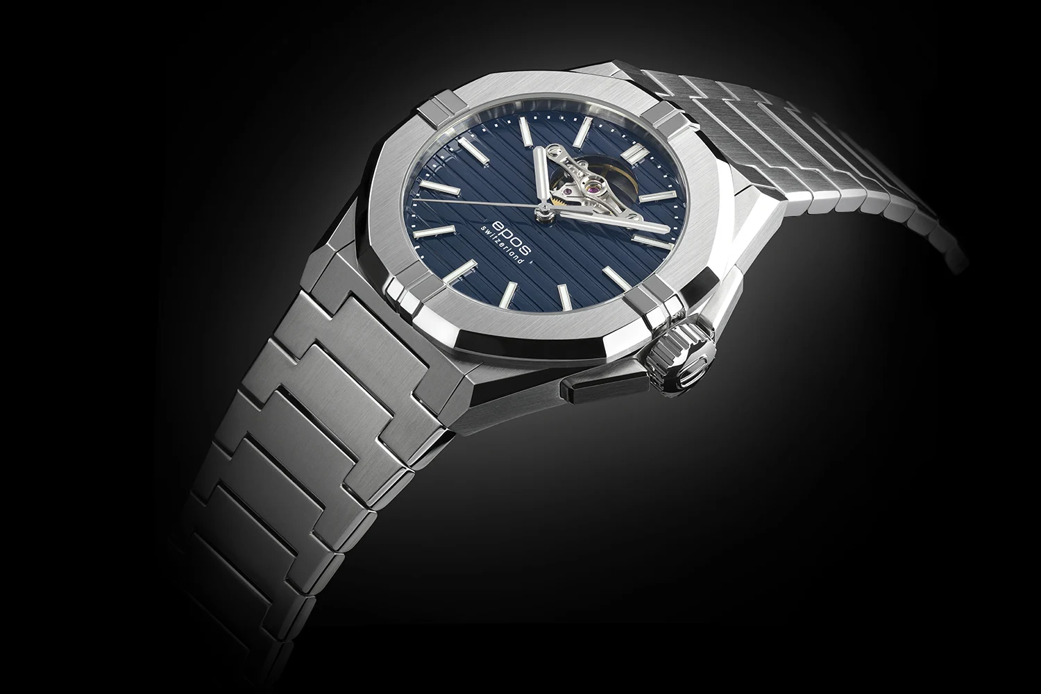 Koperta o średnicy 41 mm została zaprojektowana z naciskiem na dynamiczne linie i wyraziste geometryczne krawędzie. Połączenie szczotkowanych i polerowanych powierzchni nadaje zegarkowi efektowną głębię, a poziomy gilosz na tarczy buduje spójny, sportowy rytm. Okno Open Heart umieszczone na godzinie 12 odsłania pracę balansu — detal ceniony przez miłośników szwajcarskiej mechaniki, nadający modelowi wyjątkowego charakteru.