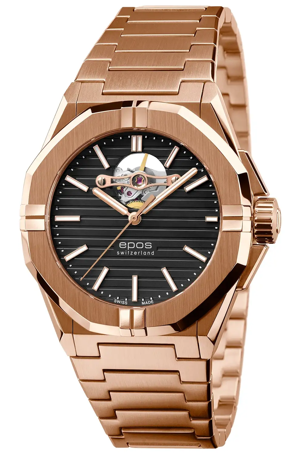 Epos Sport Open Heart 3506.133.24.15.34 to męski zegarek automatyczny w kolorze różowego złota z czarną tarczą i widocznym balansem. Stalowa bransoleta oraz szkło szafirowe zapewniają trwałość i wygodę.