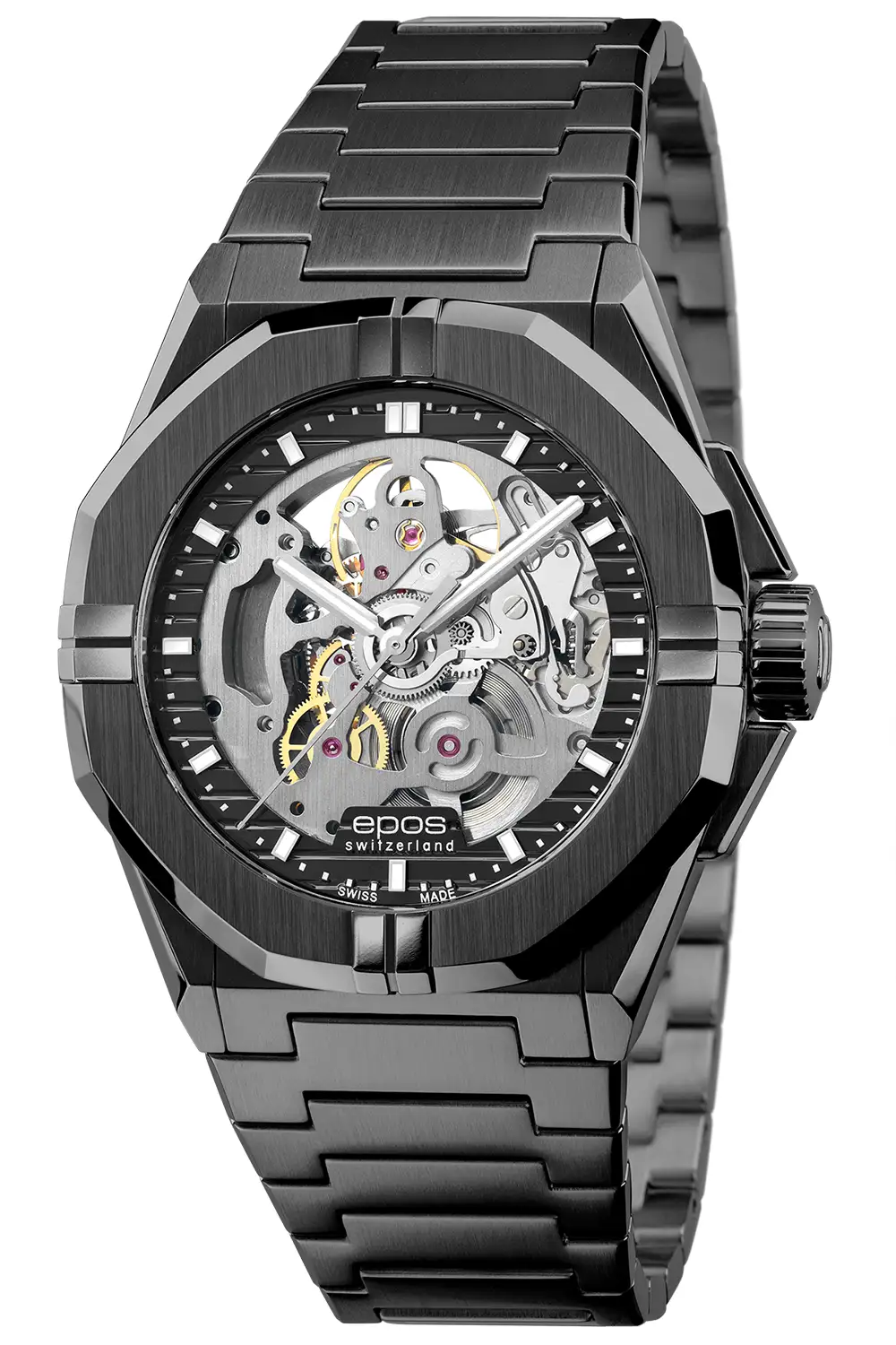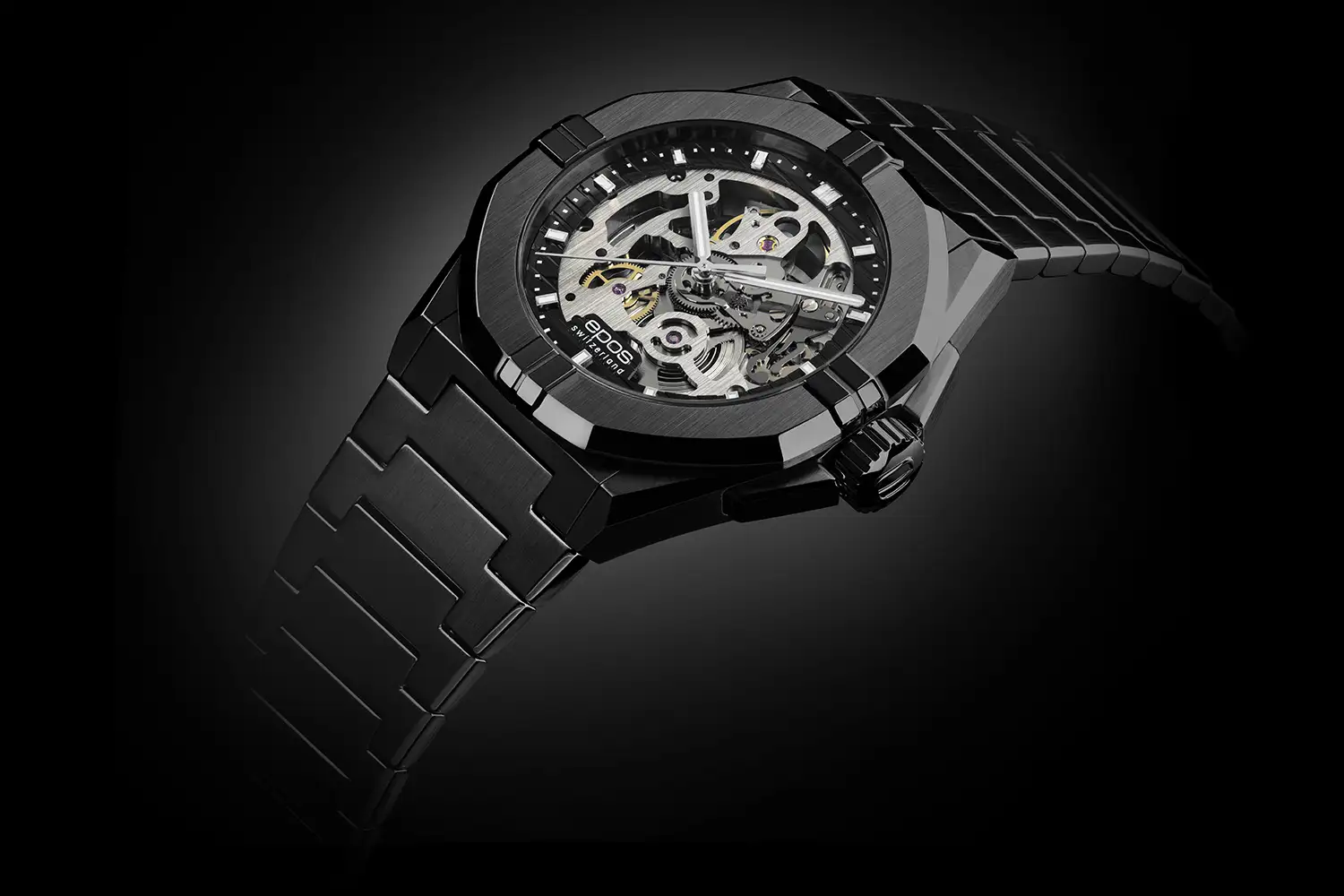 Czarny skeleton Epos z powłoką PVD odsłania pełnię pracy mechanizmu automatycznego. To nowoczesny, efektowny model o zdecydowanym charakterze.