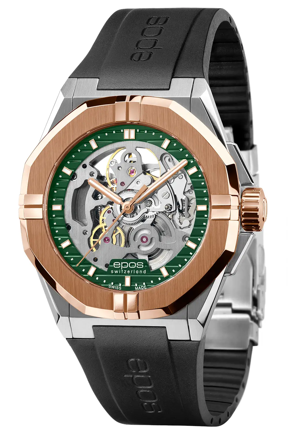 Szkieletowy Epos z różowo-złotym akcentem PVD i zielonym ringiem prezentuje pełnię pracy mechanizmu. To nowoczesny wybór dla miłośników automatyki.