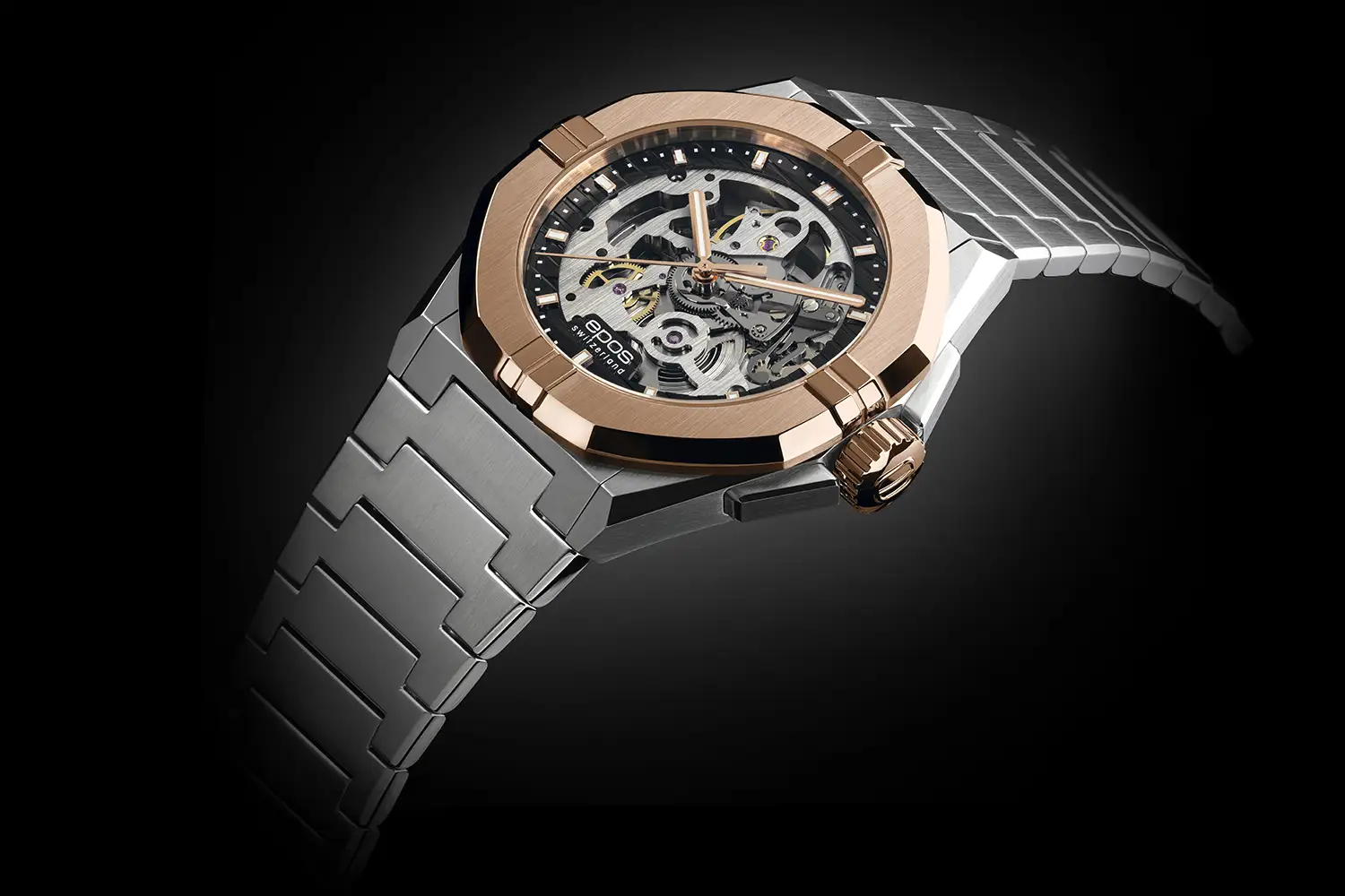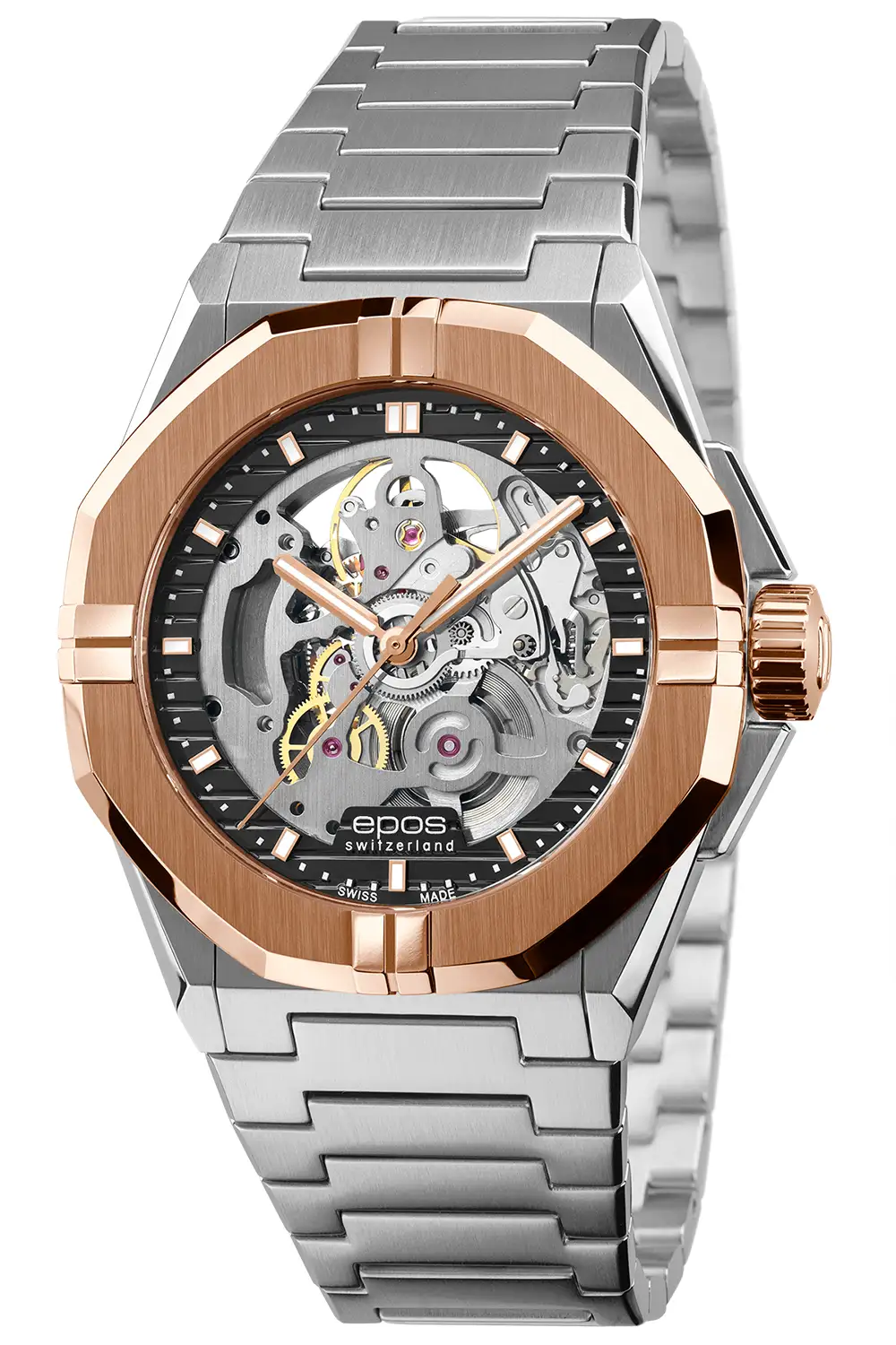 Epos Sport Skeleton z czarnym ringiem i różowo-złotym akcentem PVD odsłania pełną pracę mechanizmu. To techniczny, nowoczesny zegarek dla wymagających.