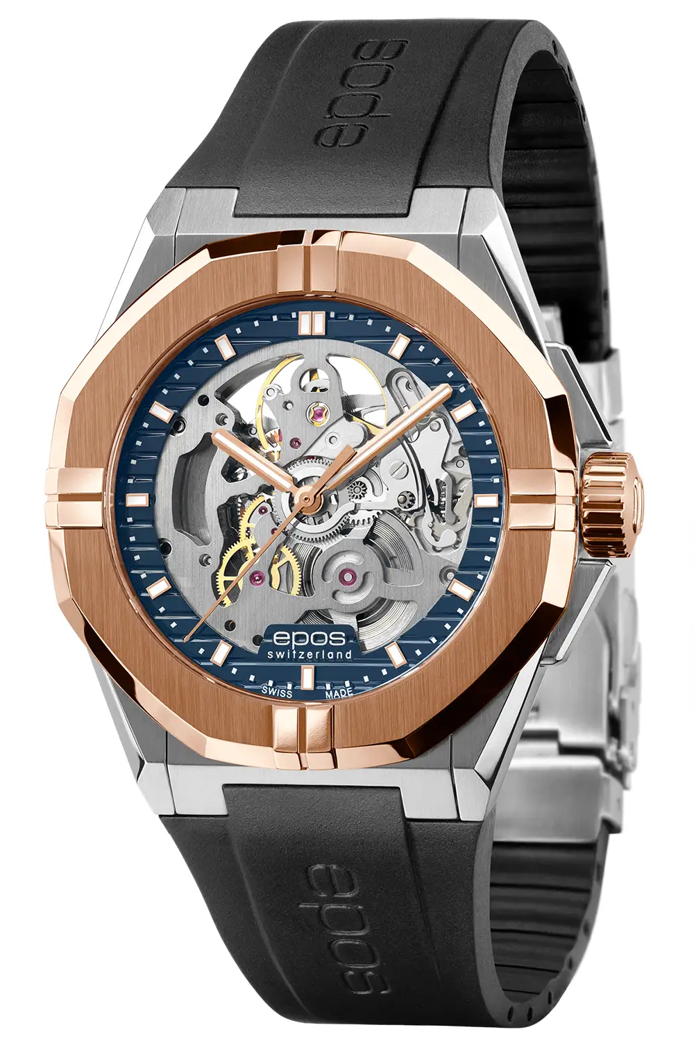 Skeleton Epos z akcentami różowego złota i granatowym ringiem odsłania pracę mechanizmu. Styl sportowy i wyrafinowany w jednym modelu.