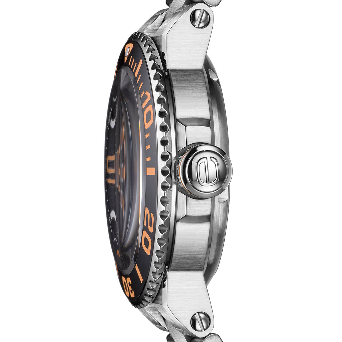Epos Sportive Diver Day Date wyposażono w przeszklony dekiel, dzięki któremu pięknie zdobiony mechanizm można podziwiać z tyłu. Czarna piaskowana tarcza ma ręcznie nakładane indeksy, które tak samo jak wskazówki są pokryte substancją luminescencyjną. Najnowsza kolekcja EPOS zaspokaja potrzeby miłośników sportowych zegarków mechanicznych z zacięciem do zegarków premium, którzy szukają dodatkowych funkcji, takich jak wskazanie dnia tygodnia i daty.