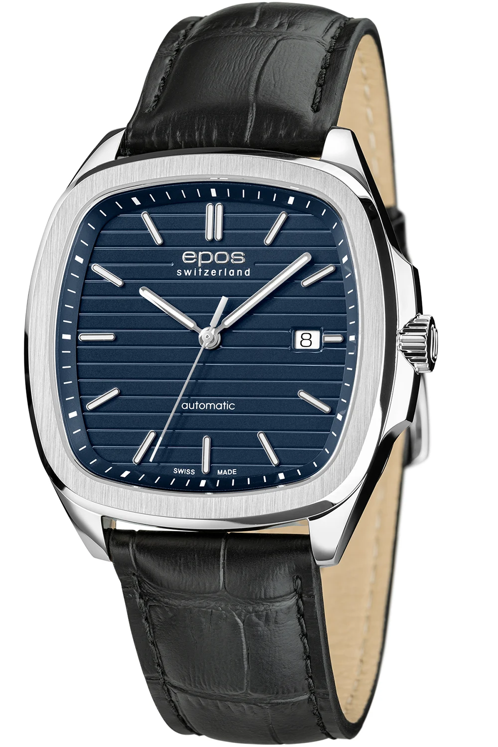 Epos Timeless 3511.152.20.16.25 to elegancki szwajcarski zegarek męski z granatową tarczą, mechanizmem automatycznym i skórzanym paskiem.