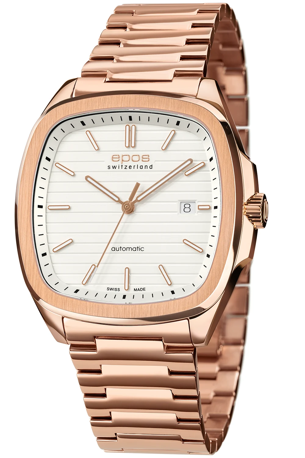 Epos Timeless 3511.152.24.10.34 to elegancki zegarek męski na bransolecie w odcieniu różowego złota, z jasną tarczą i mechanizmem automatycznym SW300.