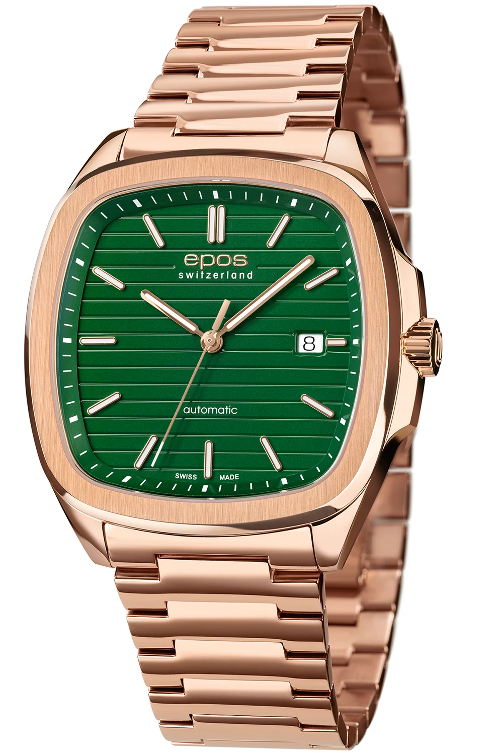 Kwadratowy, pozłacany zegarek męski Epos Timeless z zieloną tarczą i stalową bransoletą łączy elegancję z nowoczesną geometrią koperty. Mechanizm automatyczny Sellita SW300 zapewnia precyzję i smukłą konstrukcję.
