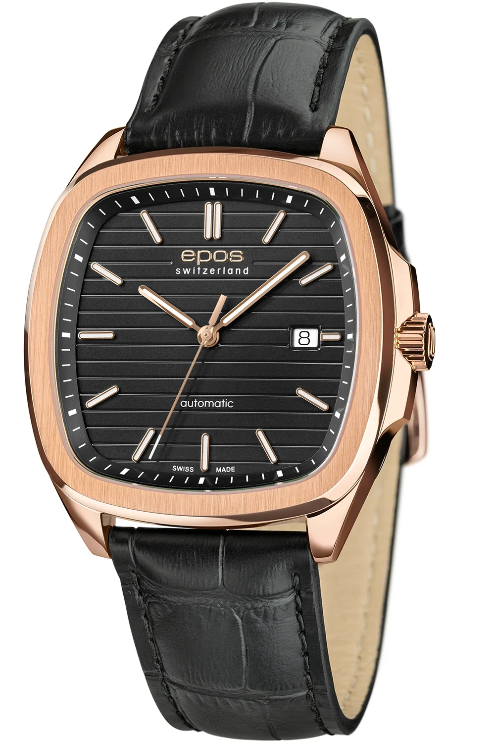 Elegancki zegarek męski Epos Timeless z ciemną tarczą i skórzanym paskiem łączy klasyczną estetykę z nowoczesną formą kwadratowej koperty. Mechanizm automatyczny SW300 gwarantuje precyzyjną pracę i szwajcarską jakość.