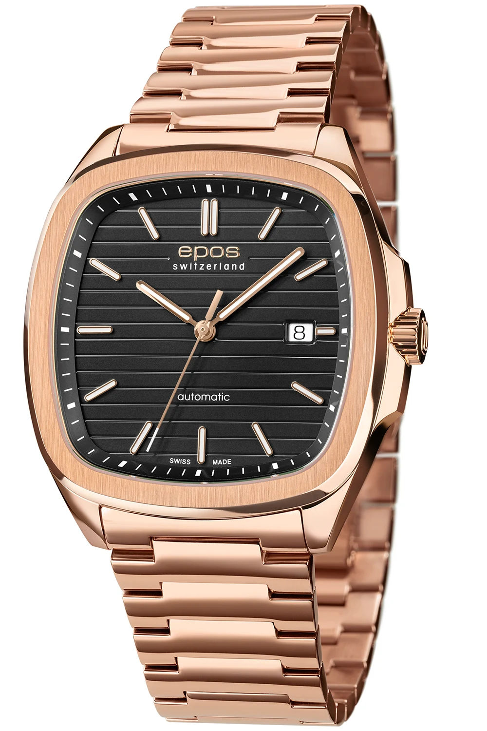 Kwadratowy zegarek męski Epos Timeless z ciemną tarczą i stalową bransoletą łączy elegancję z nowoczesną geometrią koperty. Mechanizm automatyczny Sellita SW300 zapewnia precyzję i smukłą konstrukcję.