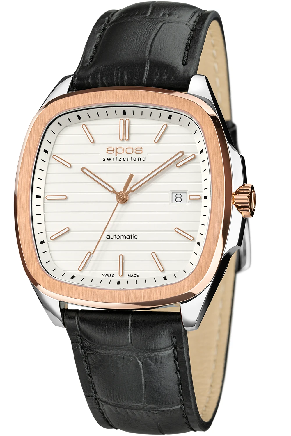 Elegancki zegarek męski Epos Timeless z białą tarczą i skórzanym paskiem łączy klasyczną estetykę z nowoczesną formą kwadratowej koperty. Mechanizm automatyczny SW300 gwarantuje precyzyjną pracę i szwajcarską jakość.