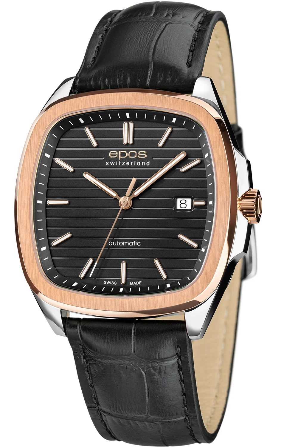 Epos Timeless 3511.152.34.15.25 to elegancki zegarek męski o kwadratowej kopercie z akcentem różowego złota. Czarna tarcza z delikatnym wzorem oraz skórzany pasek tworzą stylową całość.