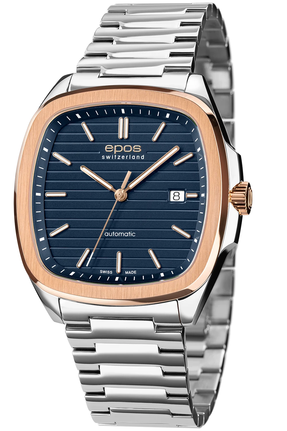 Epos Timeless 3511.152.34.16.30 to szwajcarski zegarek automatyczny dla mężczyzn, którzy cenią elegancję w nowoczesnym wydaniu. Kwadratowa koperta o szerokości 40 mm, połączona z różowozłotym pierścieniem i stalową bransoletą, tworzy harmonijny design idealny do codziennych i formalnych stylizacji.