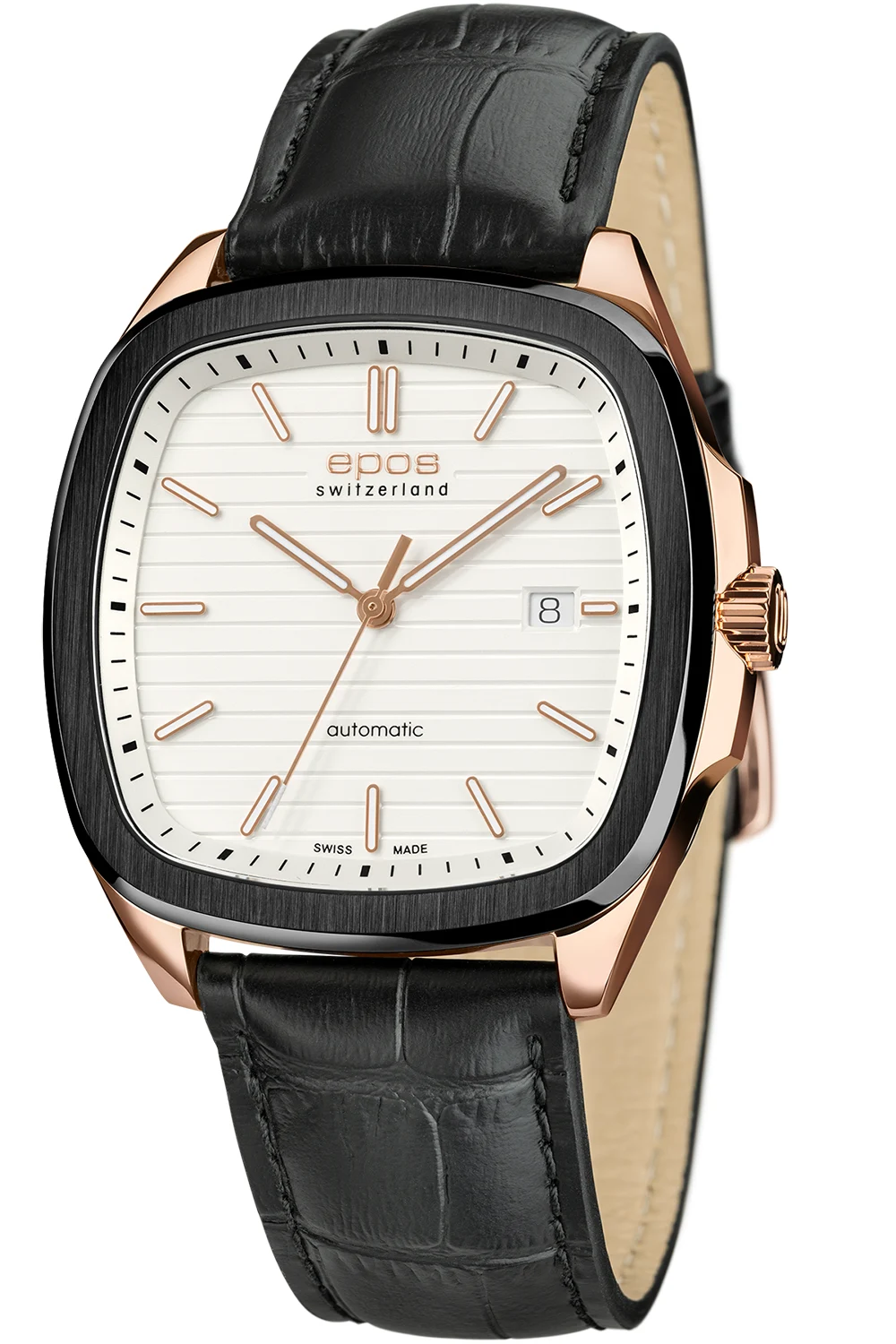 Zegarek męski Epos Timeless 3511.152.55.10.25 to kwadratowy zegarek automatyczny w kopercie PVD różowe złoto z czarnym pierścieniem i jasną tarczą, na eleganckim skórzanym pasku.