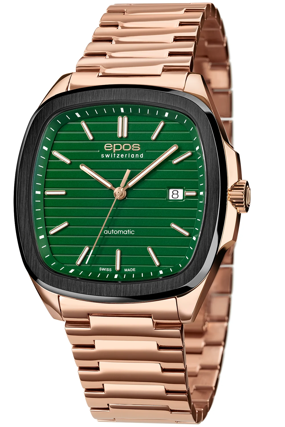 Głęboki, zielony kolor tarczy z poziomymi tłoczeniami dodaje modelowi dynamicznego charakteru, a indeksy i wskazówki z luminacją gwarantują czytelność w każdych warunkach. Zegarek automatyczny Epos wyposażono w mechanizm Sellita SW300, widoczny przez przeszklony dekiel, co stanowi dodatkową wartość dla miłośników szwajcarskiego rzemiosła.