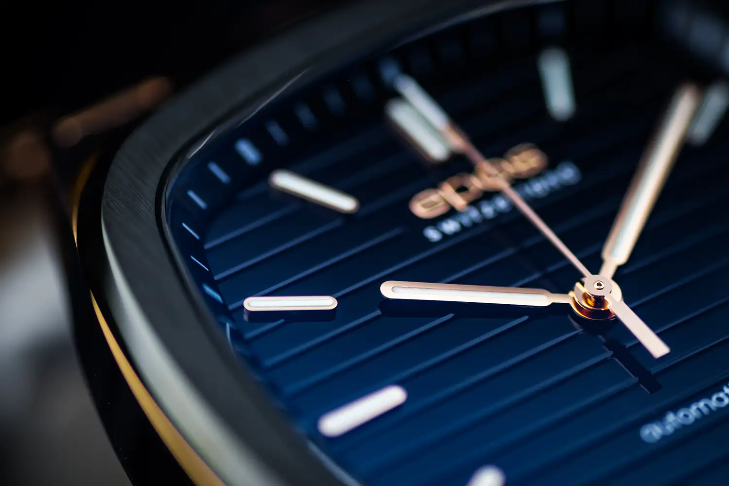 Czarna tarcza z poziomym zdobieniem prezentuje minimalistyczne indeksy i wskazówki w odcieniu różowego złota. Zastosowana masa luminescencyjna poprawia ich czytelność po zmroku, a datownik na godzinie trzeciej dopełnia kompozycji. Pod przeszkleniem pracuje precyzyjny mechanizm automatyczny Sellita SW300, którego działanie można obserwować przez przeszklony dekiel – to jeden z elementów, który wielu miłośników docenia w zegarkach mechanicznych.