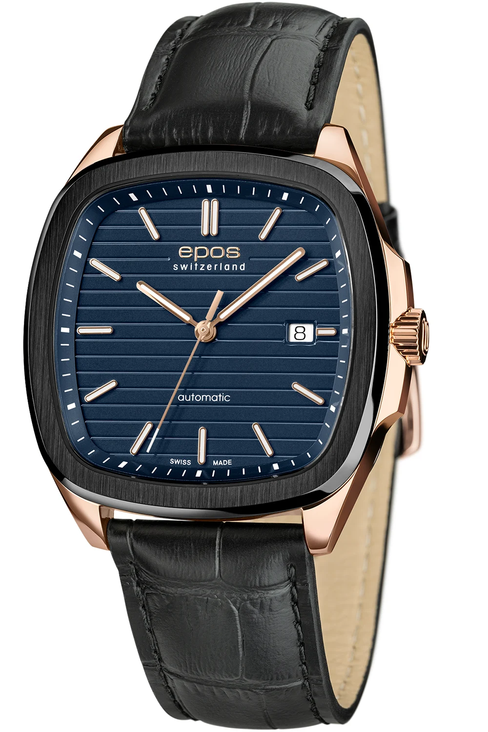 Epos Timeless 3511.152.55.16.25 to elegancki zegarek męski z granatową tarczą i kopertą 40 mm w wykończeniu różowego złota PVD. Czarny pierścień PVD oraz pasek skórzany podkreślają jego klasyczny charakter. Transparentny dekiel ukazuje pracę mechanizmu automatycznego.