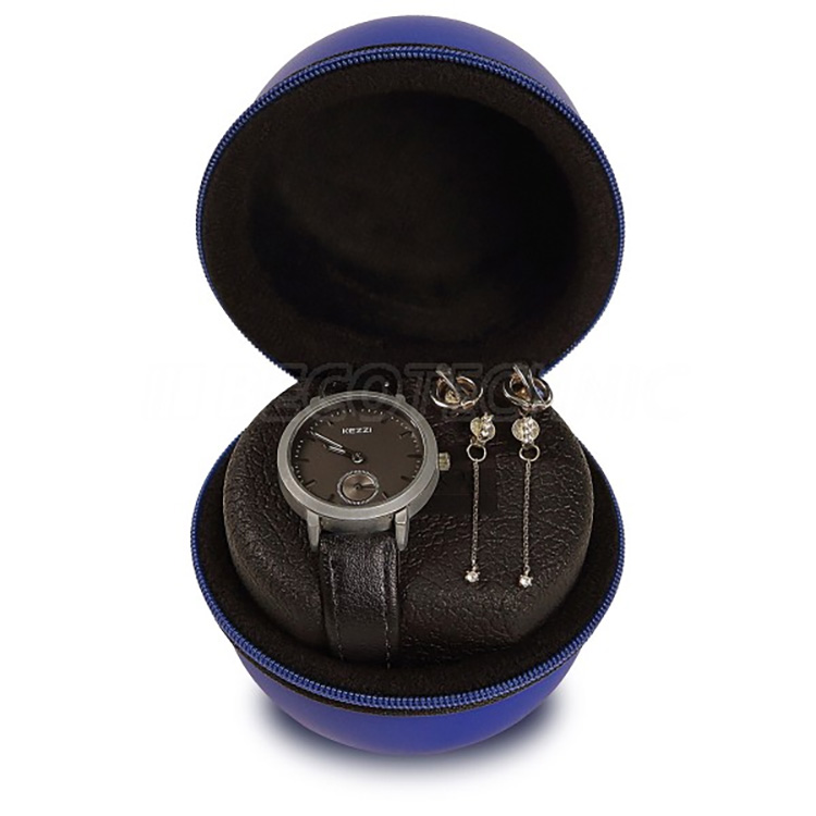 Niebieskie etui na jeden zegarek Boxy 324172 wykonane z EKO skóry z dopasowanym zamkiem błyskawicznym. Poręczny design, idealny do podróży. Nadaje się również jako schowek na kable lub słuchawki. Dołączona poduszka do zegarka pasuje do wszystkich rotomatów Boxy. Zegarek i poduszkę można wyjąć razem z etui i włożyć do rotomatu.