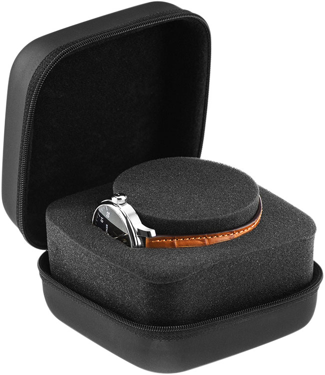 Kwadratowe etui na jeden zegarek wykonane z matowego tworzywa sztucznego z zamkiem suwakowym. Twarda konstrukcja, doskonała ochrona. Czasomierz jest całkowicie zamknięty w miękkiej, sprężystej piance, która zapobiega przesuwaniu się zegarka w etui podczas transportu. Idealne na zegarki z bransoletą lub paskiem.