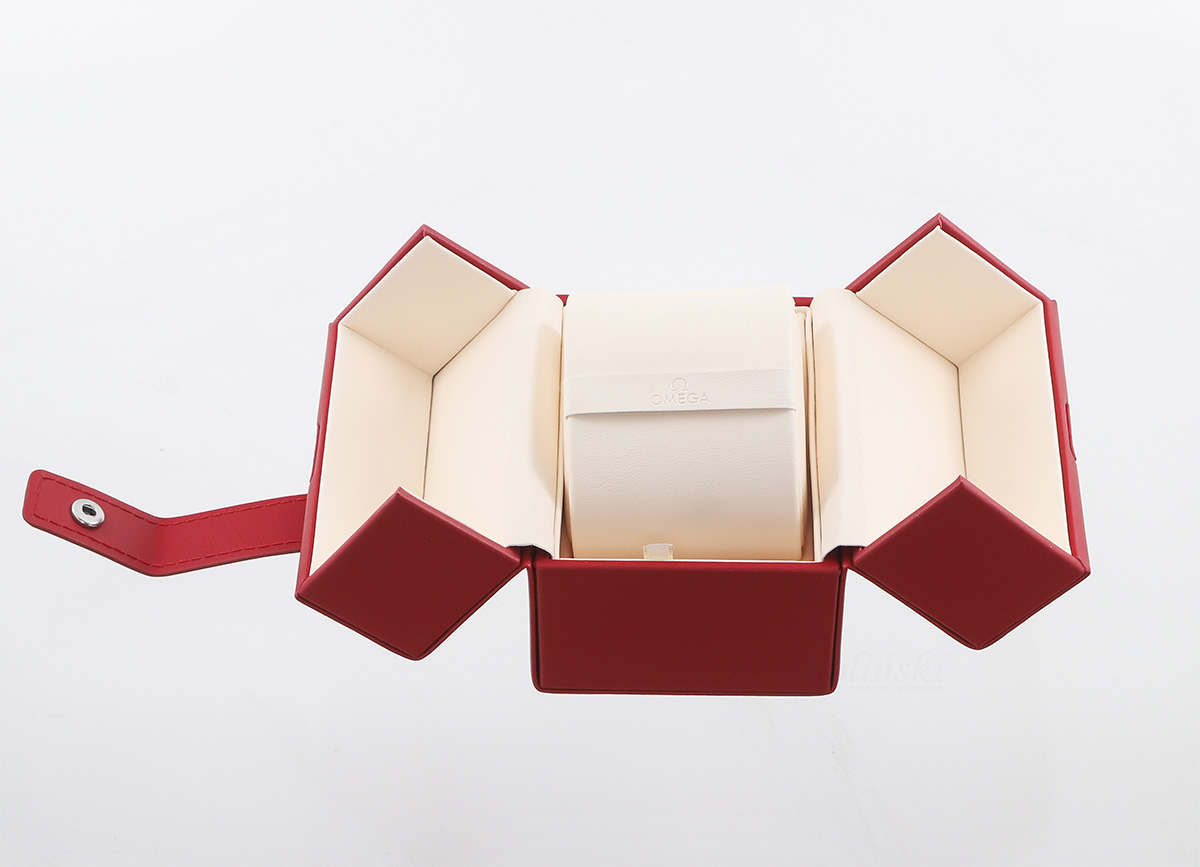Transportowe pudełko, opakowanie na zegarek Omega. Zamykane na klips, kolor czerwony.