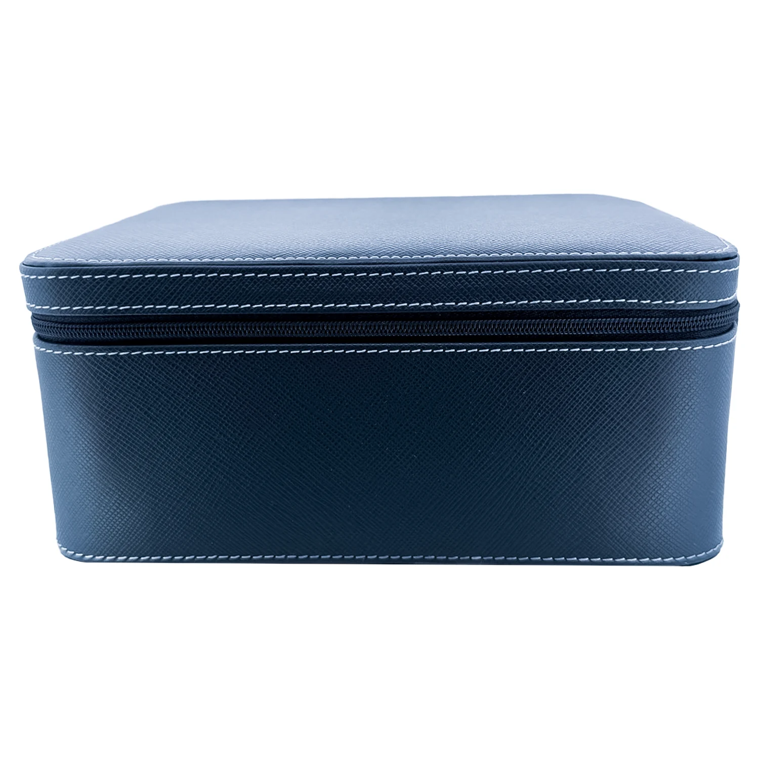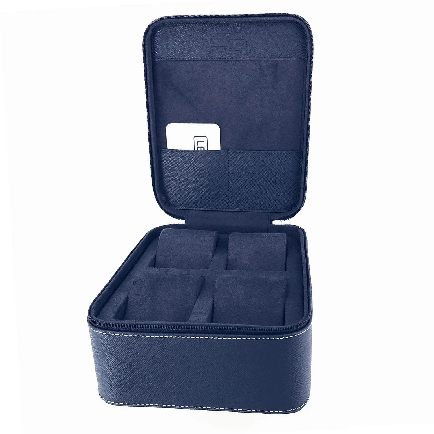Konstrukcja oparta na solidnym szkielecie pokrytym naturalną skórą w wykończeniu saffiano w kolorze Navy Blue wyróżnia się elegancją i ponadczasowym stylem. Zamek błyskawiczny otwiera wnętrze wyłożone miękkim materiałem, w którym znalazły się cztery oddzielne poduszki. Dzięki nim każdy zegarek ma swoje miejsce, jest stabilny i chroniony przed zarysowaniami. Dodatkowa kieszeń wewnętrzna pozwala schować dokumenty lub karty gwarancyjne. Etui ma kompaktowe wymiary 20 × 16 × 9 cm, co czyni je idealnym do walizki lub domowej szuflady.