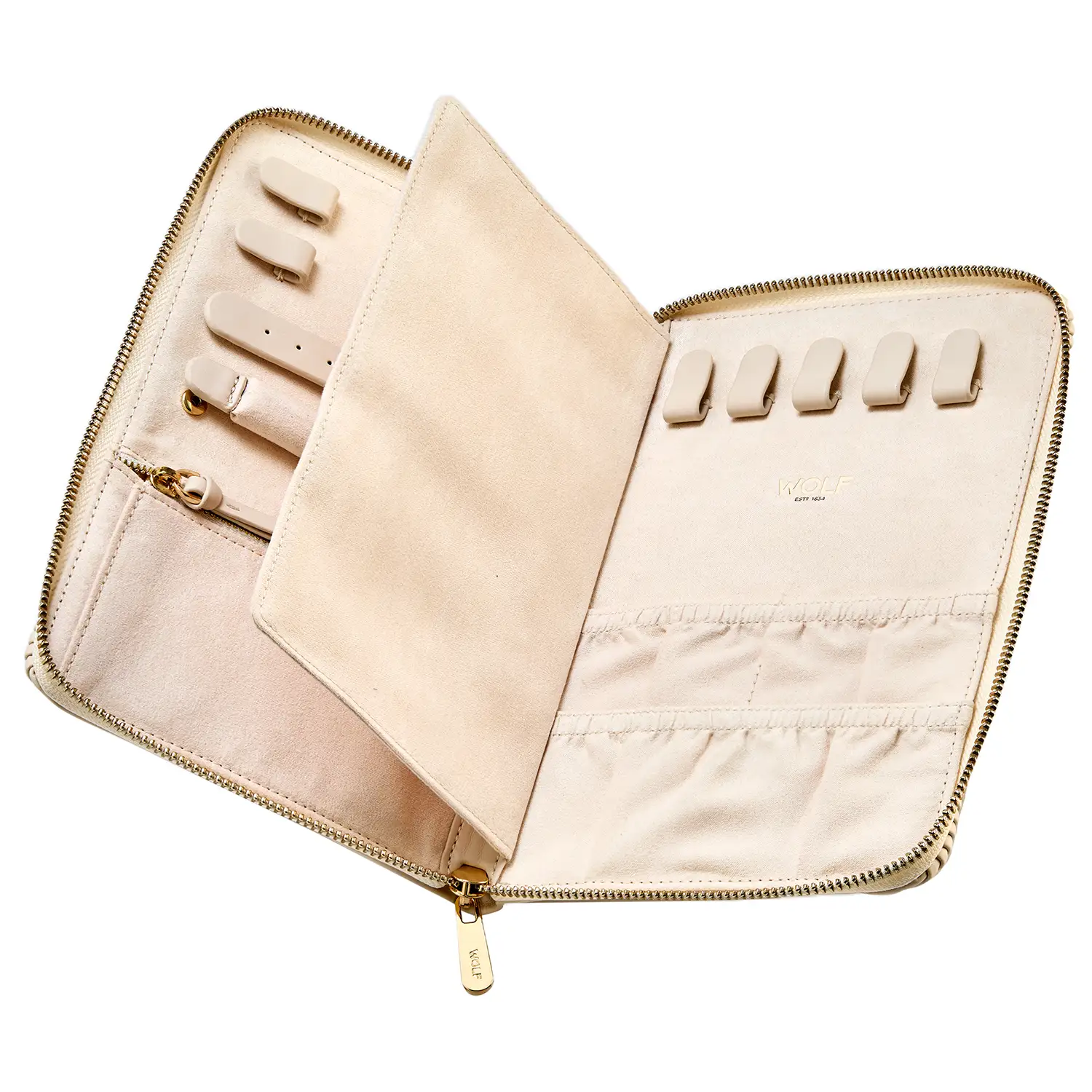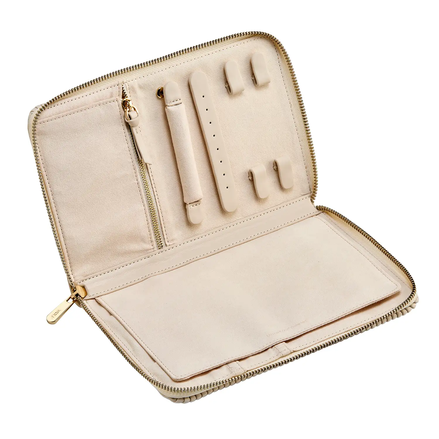 W środku znajduje się podszycie z innowacyjną tkaniną LusterLoc™, chroniącą biżuterię przed matowieniem. Przemyślany układ obejmuje 5 haczyków na łańcuszki oraz 4 na bransoletki, każdy z elastyczną kieszonką zabezpieczającą przed splątaniem. Wnętrze oferuje również miejsce na kolczyki i pierścionki oraz praktyczną kieszeń zapinaną na suwak na drobne akcesoria.