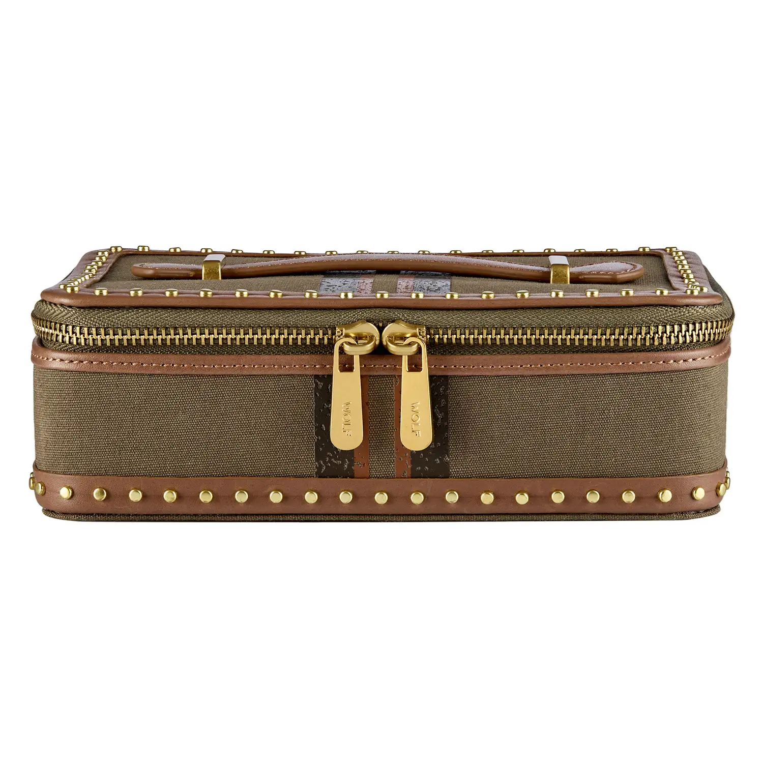 WOLF Ida 190042 to eleganckie etui podróżne na biżuterię, stworzone z myślą o kobietach ceniących luksus, organizację i zrównoważony styl życia. Inspirowane klasycznymi kuframi podróżnymi, łączy płócienną tkaninę z recyklingu z detalami ze skóry naturalnej z garbarni o złotym standardzie. Charakterystyczne mosiężne nity, podwójny zamek błyskawiczny i skórzany uchwyt nadają mu wyjątkowego charakteru vintage.