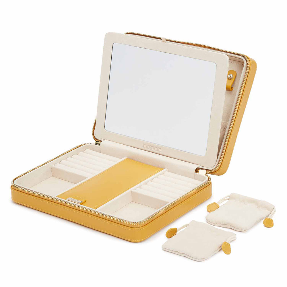 Duże, eleganckie etui na biżuterię WOLF 766193 w kolorze musztardowym to wyrafinowany klasyk swego gatunku. Czyste linie i wyważona ilość detali. Etui skórzane z przegrodami na biżuterię z kolekcji Maria to idealna propozycja dla podróżniczek zakochanych w odwiedzaniu nowych miast i poznawaniu nowych ludzi. Wolf Maria to pierwsza tak bogata kolekcja owinięta ręcznie wykonaną, gładką skórą w barwnych odcieniach oraz ozdobiona oszałamiającymi, złotymi akcentami. Zabierz swoje ekskluzywne etui, dokądkolwiek zmierzasz i przechowuj swoją biżuterię we właściwym miejscu, kreując przy tym unikalny styl podróżowania. Stwórz go, jednocząc biznes, wypoczynek oraz wszystko pomiędzy.