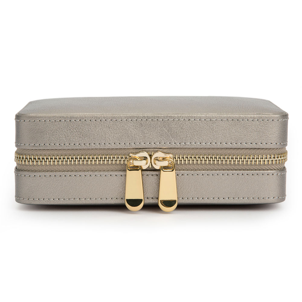 Eleganckie i wyrafinowane etui na biżuterię WOLF Palermo 213678 w kolorze szarym. Wykonane ręcznie z prawdziwej skóry. Nazwa kolekcji zaczerpnięta od miasta o tej samej nazwie na zboczu góry nad morzem. Przechowuj swoje ulubione ozdoby i pamiątki w tym wspaniałym etui na suwak podczas każdej podróży. Etui jest wysłane od środka tkaniną Wolf LusterLoc™, która zapobiega matowieniu biżuterii. Elegancji dodają złote wykończenia.