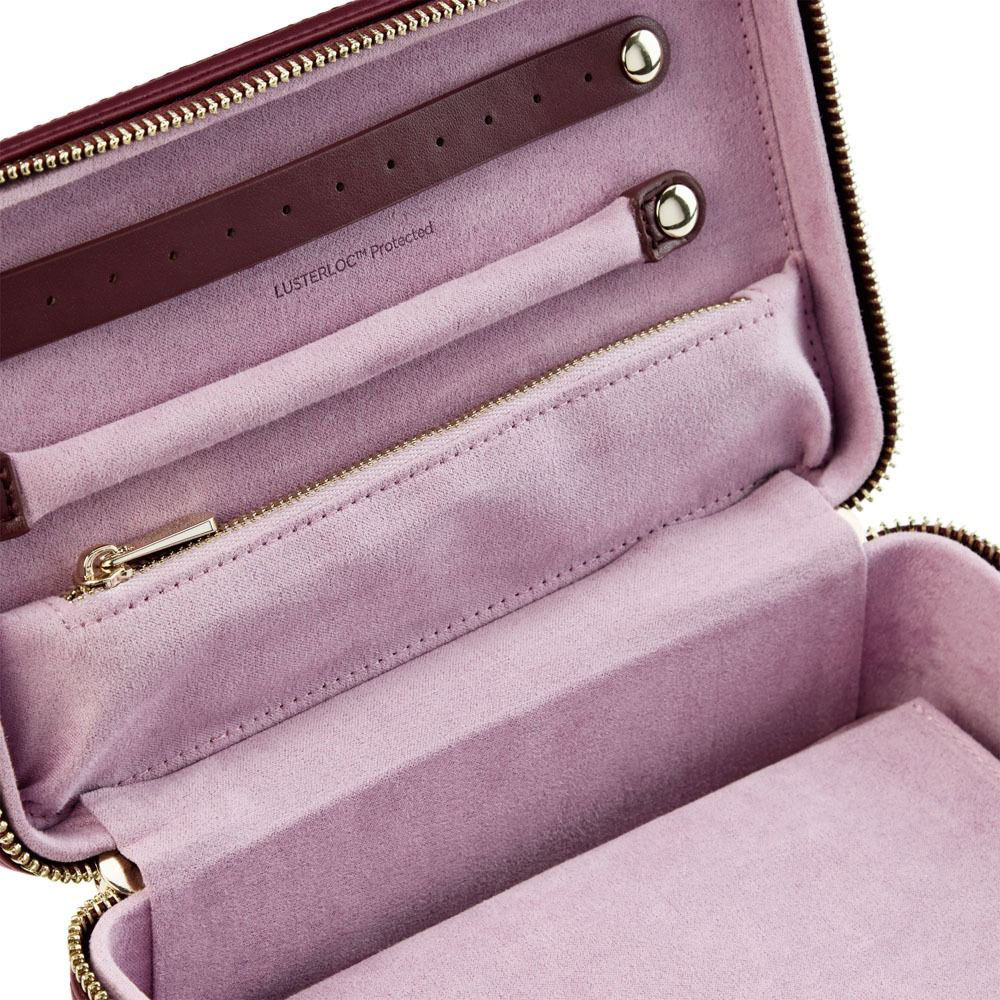 Wnętrze w jasnofioletowym odcieniu zaprojektowano z myślą o uporządkowanym przechowywaniu – znajdziemy tu kieszonkę zapinaną na suwak, pasek do mocowania kolczyków i pierścionków oraz przestrzeń na drobniejsze elementy biżuterii. Całość wyściełano innowacyjnym materiałem LusterLoc™, który neutralizuje gazy powodujące matowienie, zapewniając ochronę biżuterii nawet przez 35 lat. Kompaktowe rozmiary i solidny zamek sprawiają, że etui idealnie sprawdzi się podczas podróży. Etui WOLF x Liberty 381227 to połączenie funkcjonalności, elegancji i rzemiosła, które doskonale sprawdzi się u każdej miłośniczki biżuterii.