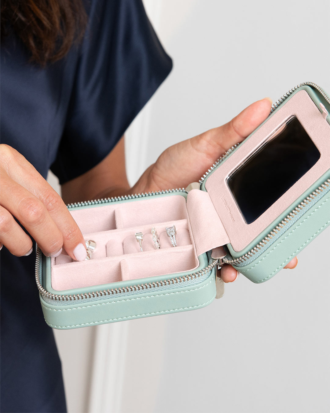 Eleganckie i kompaktowe etui na biżuterię WOLF ze skóry wegańskiej. Małe etui zamykane na zamek błyskawiczny wykończone jest materiałem LusterLoc™. Doskonała jakość wykonania i dopracowane detale. Specjalne przegrody na kolczyki, pierścionki i inne dodatki.