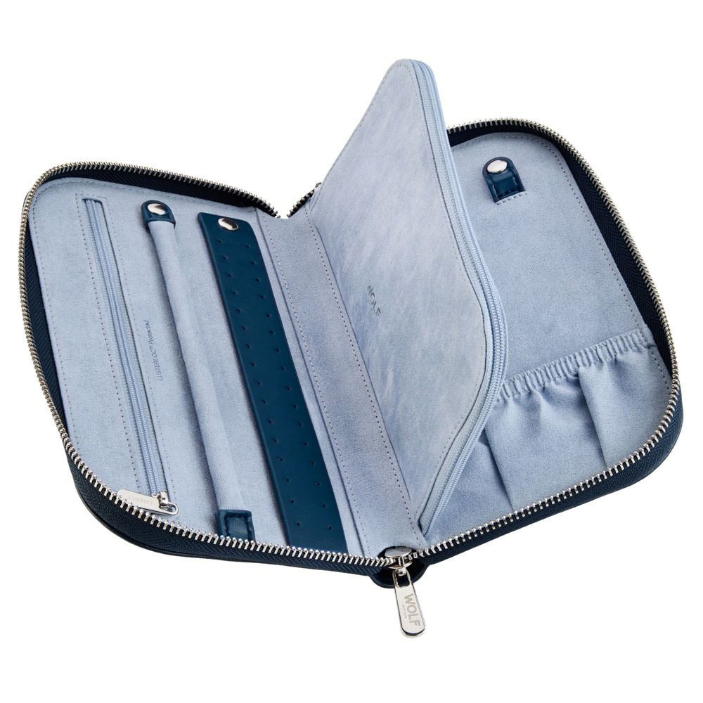 Wnętrze w jasnoniebieskim odcieniu zostało zaprojektowane z myślą o podręcznym przechowywaniu – wyposażono je w kieszonkę zapinaną na suwak, pasek na kolczyki i pierścionki oraz elastyczne przegródki na drobne elementy biżuterii. Dzięki zastosowaniu innowacyjnej wyściółki LusterLoc™ wnętrze neutralizuje gazy odpowiedzialne za matowienie, chroniąc biżuterię nawet przez 35 lat. Smukła forma i zamek na suwak sprawiają, że etui przypominające portfel doskonale nadaje się do zabrania w każdą podróż. Organizer WOLF x Liberty 381417 to eleganckie i praktyczne etui, które sprawdzi się zarówno w domu, jak i w podróży, dbając o biżuterię w sposób bezpieczny i stylowy.