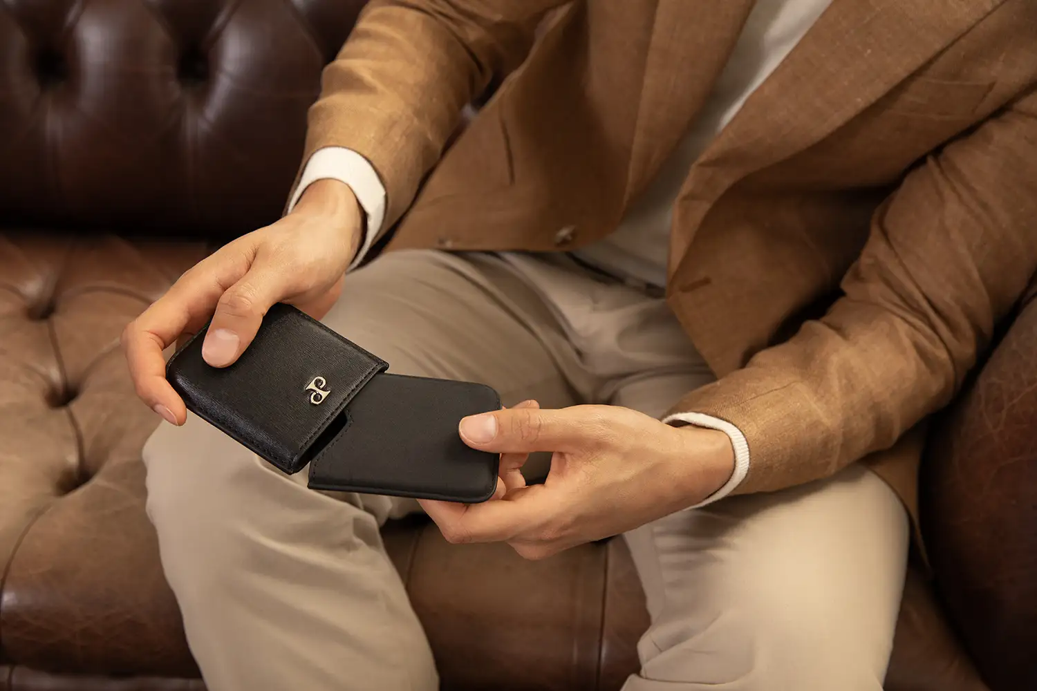 WOLF Philipp 190211 to eleganckie etui na karty biznesowe i płatnicze, które zachwyca jakością wykonania i stylowym minimalizmem. Ręcznie uszyte z czarnej tłoczonej skóry wegańskiej oraz nubuku, etui prezentuje się profesjonalnie zarówno w biurze, jak i podczas spotkań biznesowych.