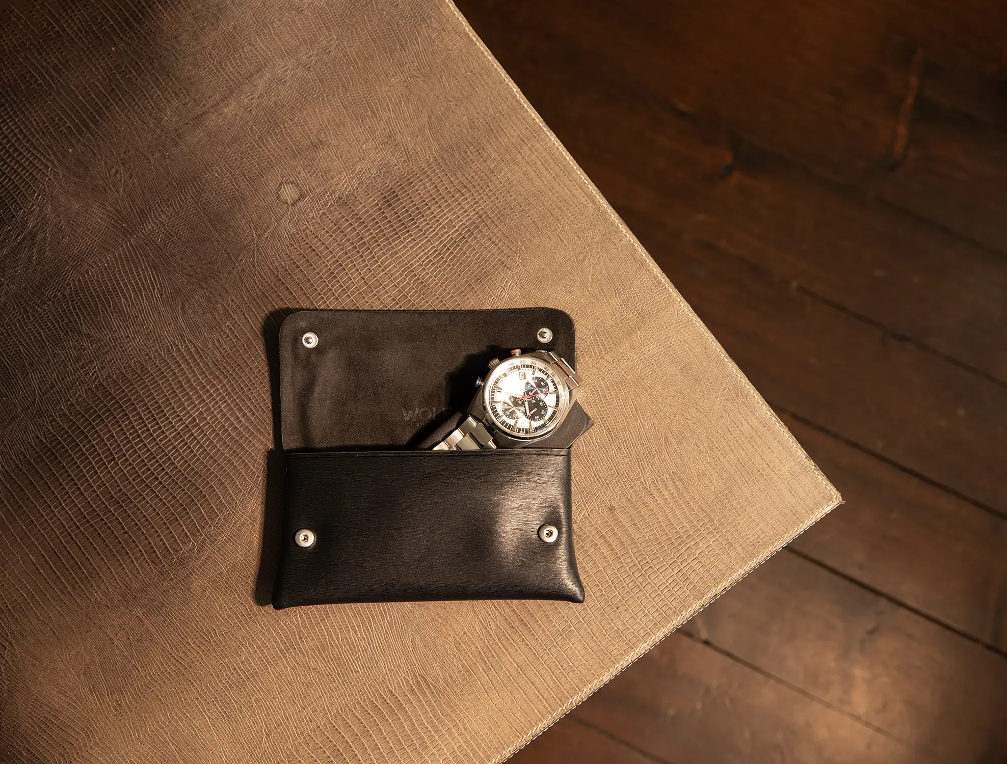 Etui WOLF Philipp 190207 to praktyczne i stylowe rozwiązanie dla miłośników zegarków, którzy cenią mobilność i bezpieczeństwo przechowywania. Ten elegancki wrap na dwa zegarki został wykonany ręcznie z czarnej, tłoczonej wegańskiej skóry, a jego wnętrze wyściełano delikatnym materiałem Ultrasuede w kolorze czarnym. Dzięki kompaktowej konstrukcji i możliwości zwinięcia idealnie sprawdza się w podróży – bezpiecznie i estetycznie zabezpiecza zegarki przed uszkodzeniem.