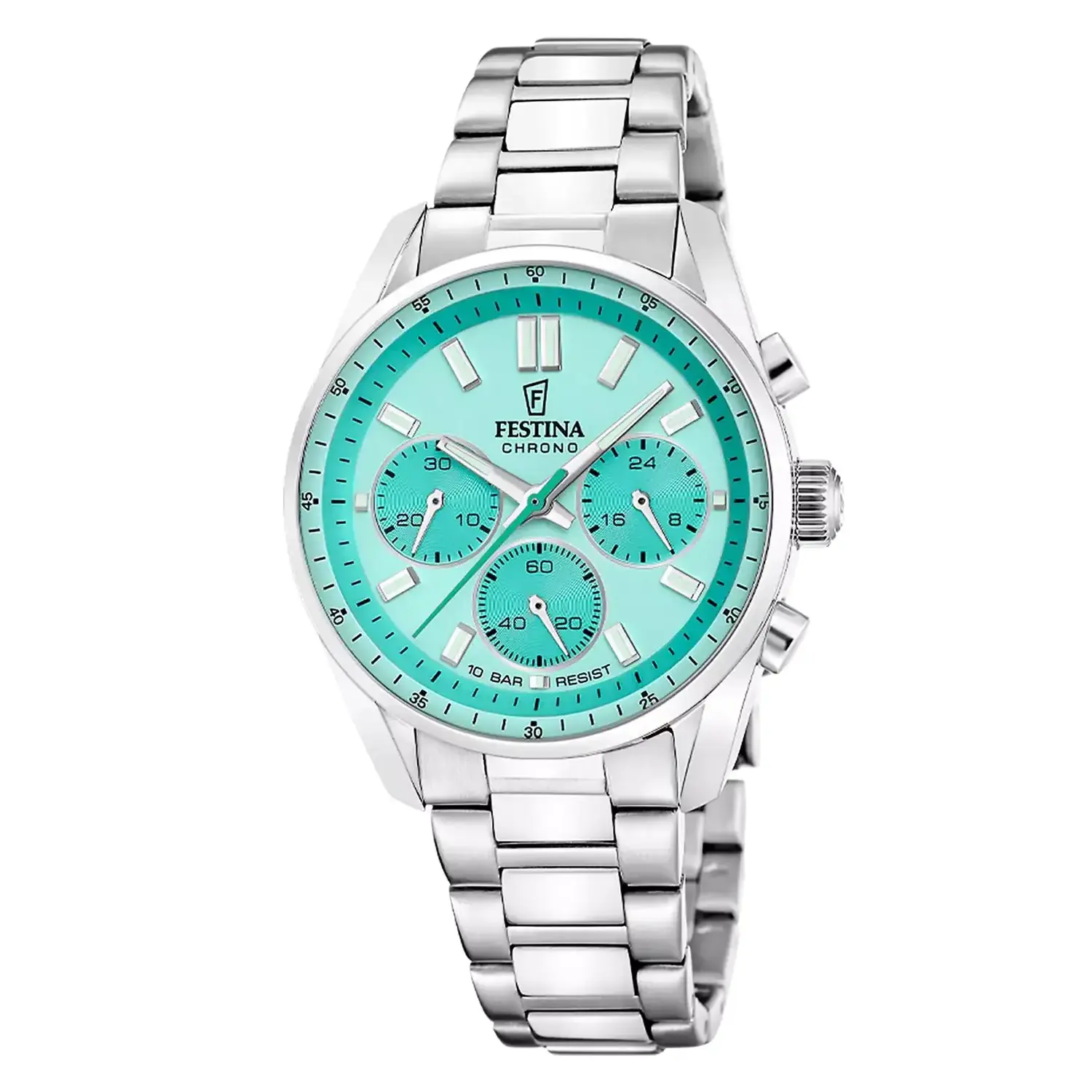Festina Boyfriend Chronograph F20753/3 to zegarek damski, który łączy sportową energię z lekką, świeżą kolorystyką. Jasnonzielona tarcza w zestawieniu ze stalową kopertą i bransoletą tworzy nowoczesną, wyrazistą kompozycję, a rozmiar 37 mm sprawia, że model prezentuje się zdecydowanie, lecz nadal proporcjonalnie na kobiecym nadgarstku.