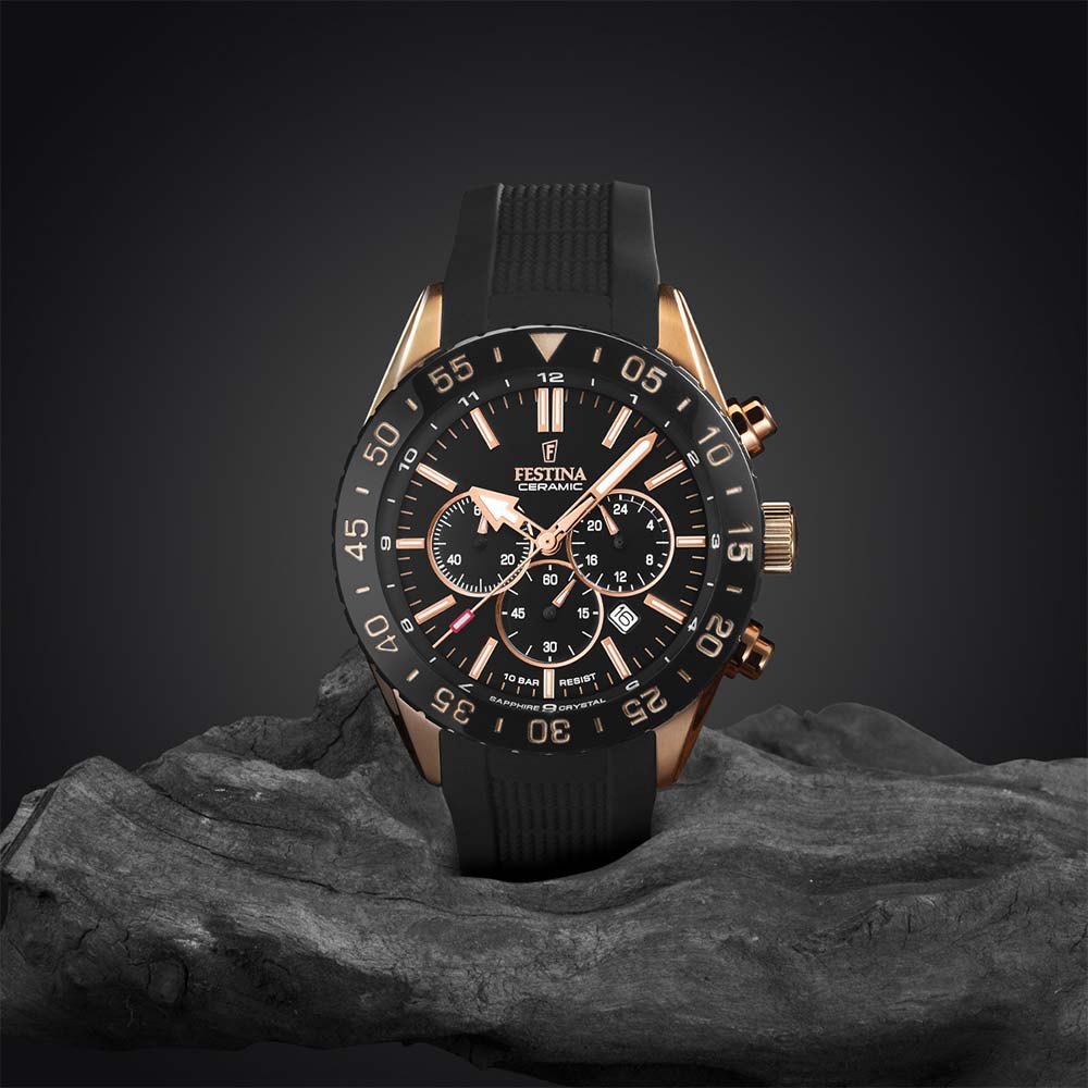 Ramka czasomierza wykonana została z wytrzymałej, odpornej na zarysowania i przede wszystkim iście stylowej ceramiki o czarnym pigmencie, służącej za fundament dla funkcjonalnej, zewnętrznej skali minutowej. Całą tarczę, widoczną nocą dzięki substancji luminescencyjnej w środku indeksów i wskazań, zabezpiecza przezroczyste i ultrawytrzymałe szkło szafirowe. Tworzywo to, za sprawą dużej twardości, zapewni doskonałą ochronę przeciw zarysowaniom. Rolę obudowy odgrywa 44-milimetrowa koperta odlana z wysokiej jakości, szlachetnej stali nierdzewnej, gwarantującej dodatkowo obronę przeciw szarzeniu i uszkodzeniom mechanicznym. Jej fasadę tworzą zarówno tekstury szczotkowane, jak i polerowane, prezentujące się jeszcze okazalej dzięki różowozłotej powłoce. To właśnie w niej między innymi można dopatrzeć się kompilacyjnej płynności, projektanckiej śmiałości oraz wyczucia mody, z jakich słynie Festina.